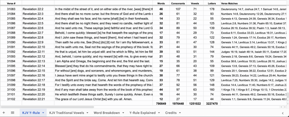 This was made in order to further explore the first and last verse anomaly in the King James Bible, where Genesis 1:1 and Revelation 22:21 have the exact same amount of letters, consonants, and vowels.